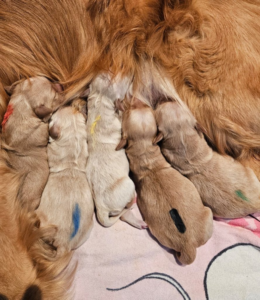 Gestern Abend hat sich unsere Familie um 5 Welpen vergrößert. Ylvie musste recht lange pressen und sich anstrengen, bis der erste Welpe geboren wurde. Aber dann kam unsere B-Mannschaft in nur 1 1/4 Stunden zur Welt. Es sind propere kleine Kerle. 2 Mädels und 3 Jungs. Die Mädels sind zwischen den Schultern markiert und die Jungs hinten. Also: Frau Rot, Frau Gelb, Herr Schwarz, Herr Blau und Herr Grün. Allen geht es gut. Ylvie hat ausreichend Milch und kümmert sich prima. Sie ist aktuell eine „Übermama“.